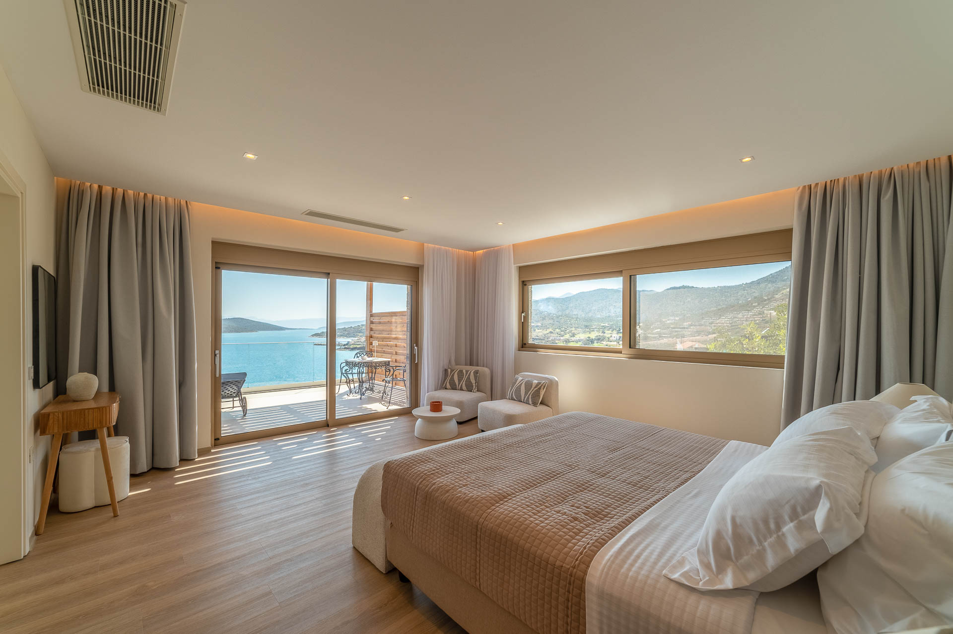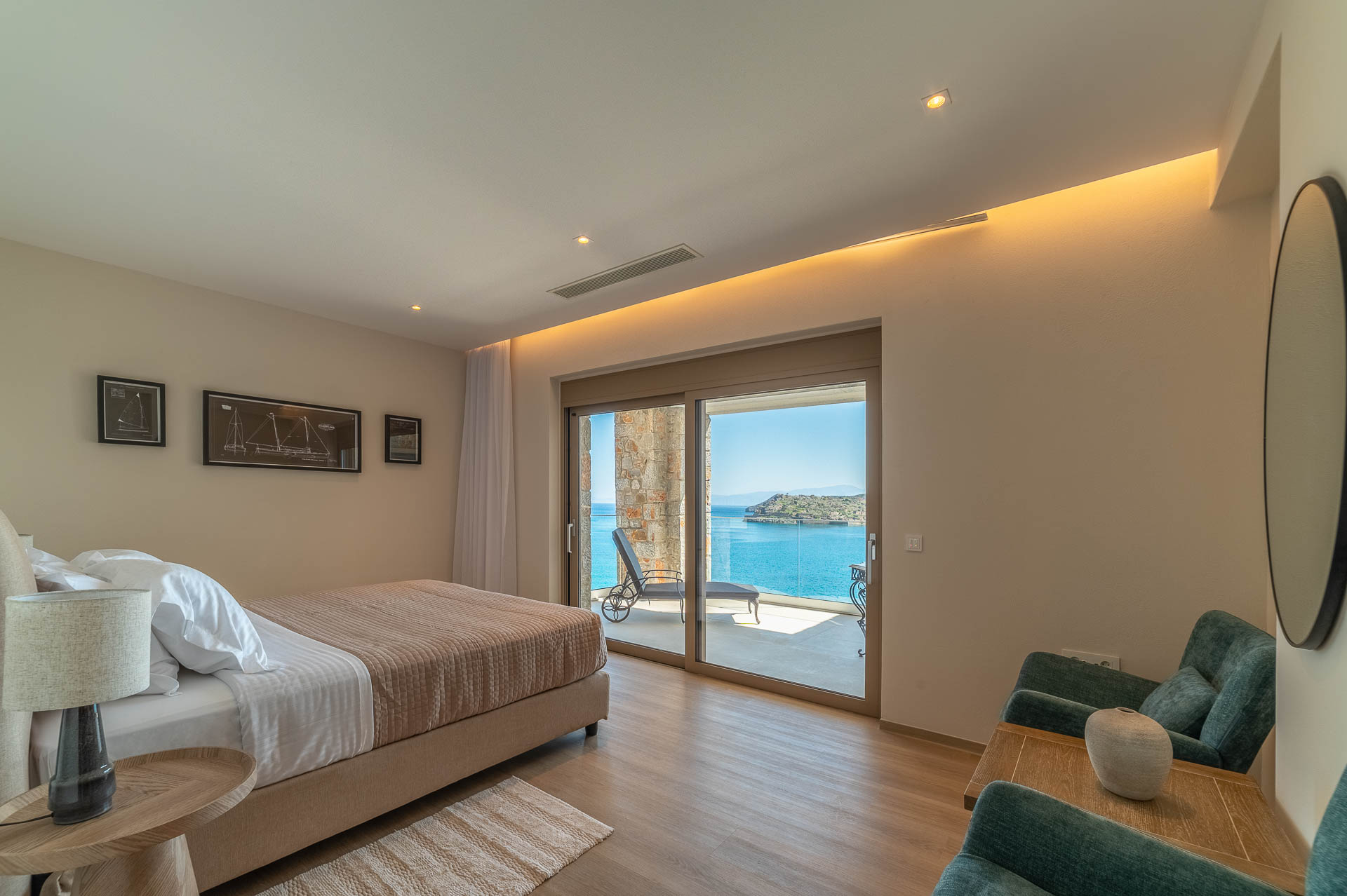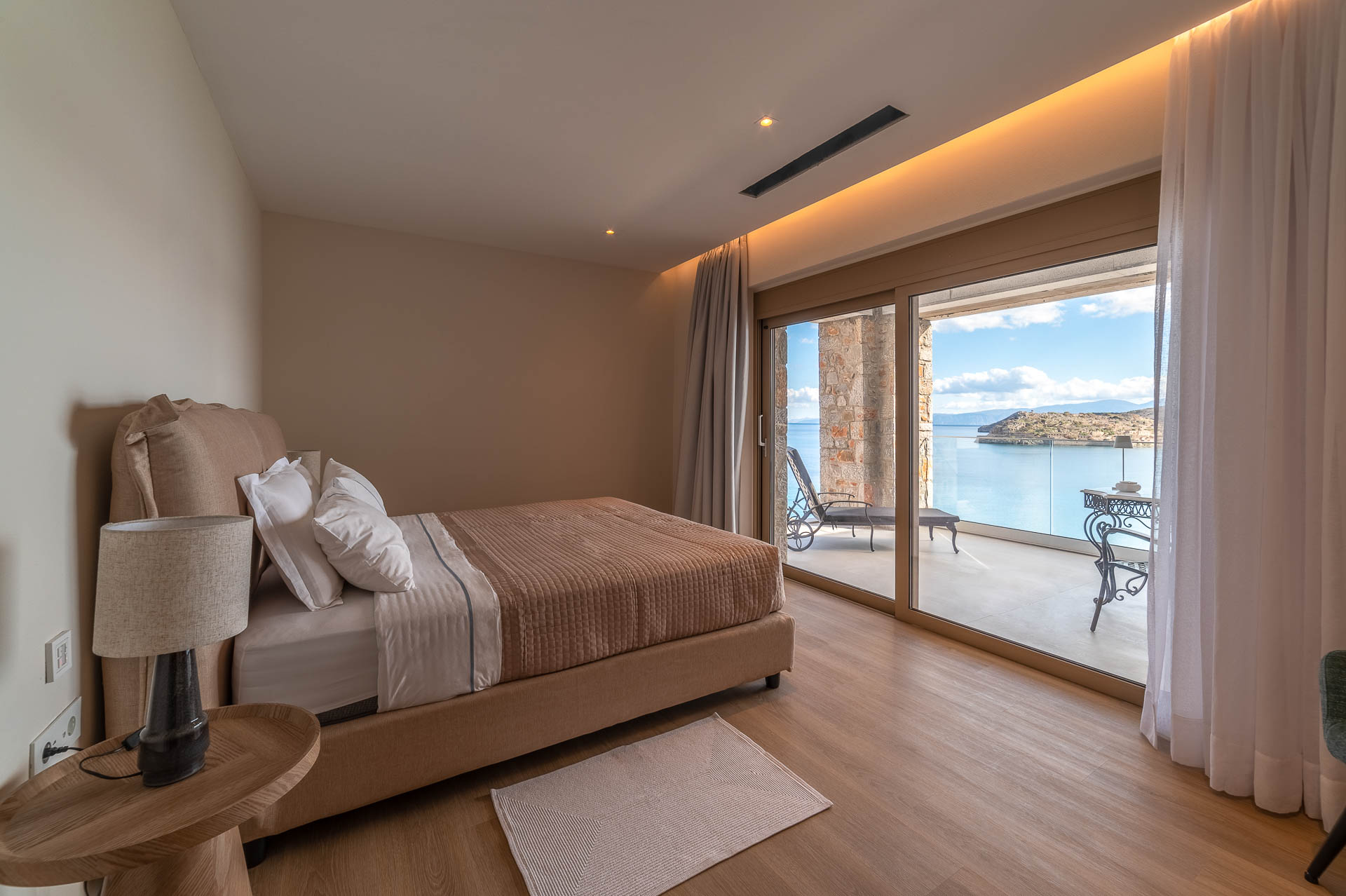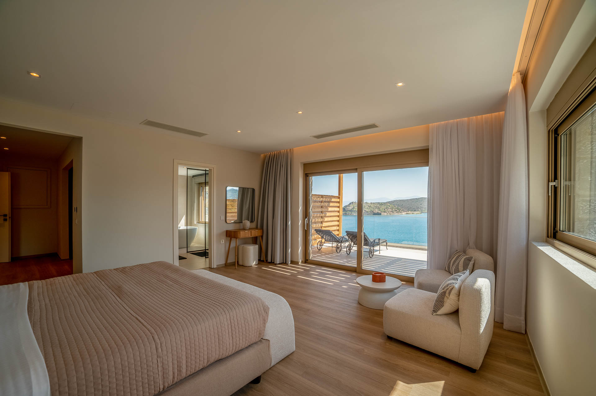 The middle layer consists of the main daytime area and the master suite of Villa Spinalonga; a huge space for the indoor and outdoor living and dining areas on the pool's level. The modern design in off-white and beige tunes match perfectly with the unstoppable view from the Aegean Sea and the islet of Spinalonga. The oversized twin sofas call you to snuggle and luxuriate in the impressive scenery through the expansive sliding glass doors. The stylish dining area is ideal for gatherings, enjoying any meal you wish, and gazing at the enchanting beauty of Spinalonga's Islet. The fully equipped kitchen with an island table and a wine fridge boasts all the major appliances necessary to whip up a delicious meal. All furniture and electrical appliances are selectively chosen with high quality.