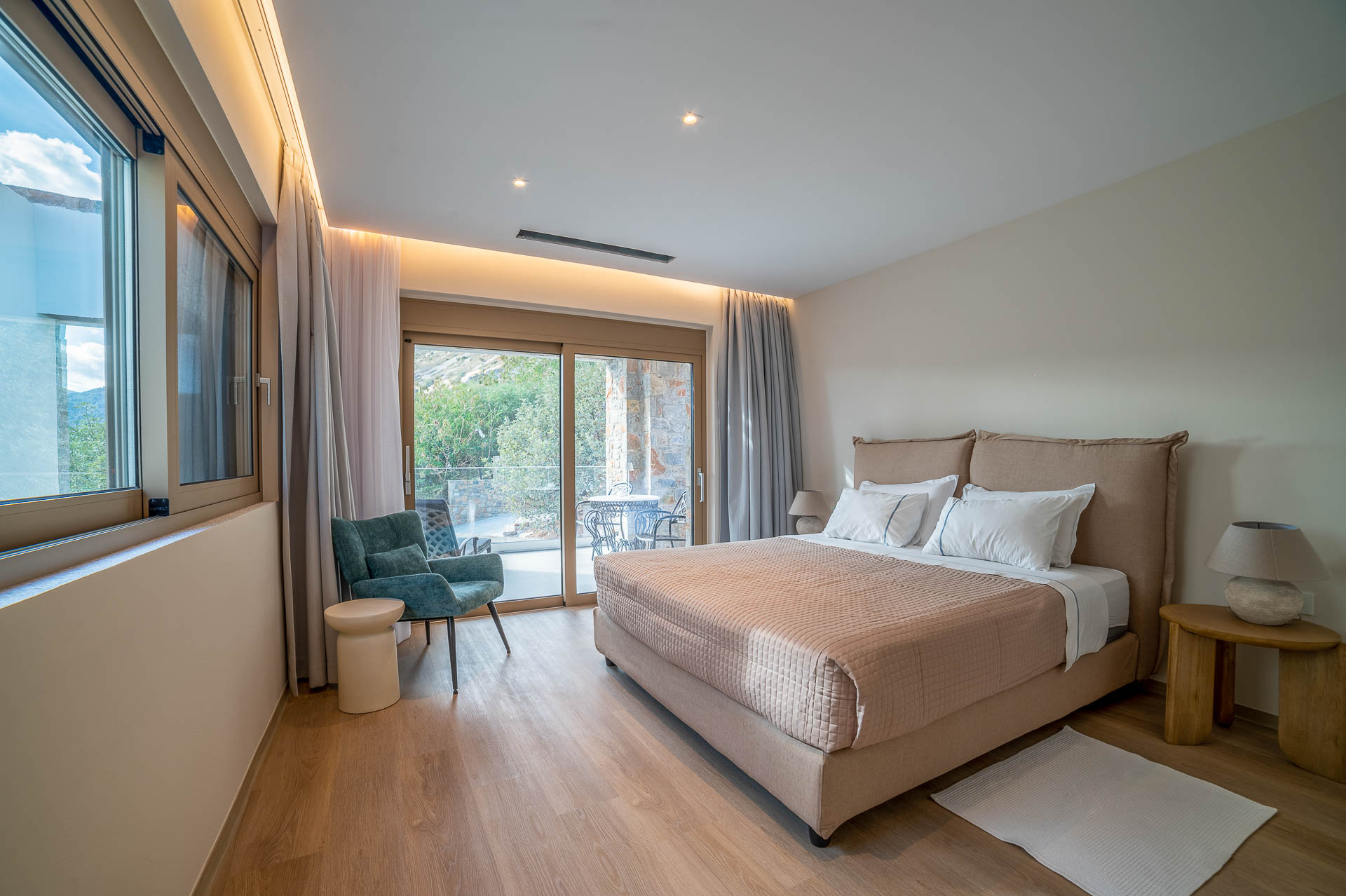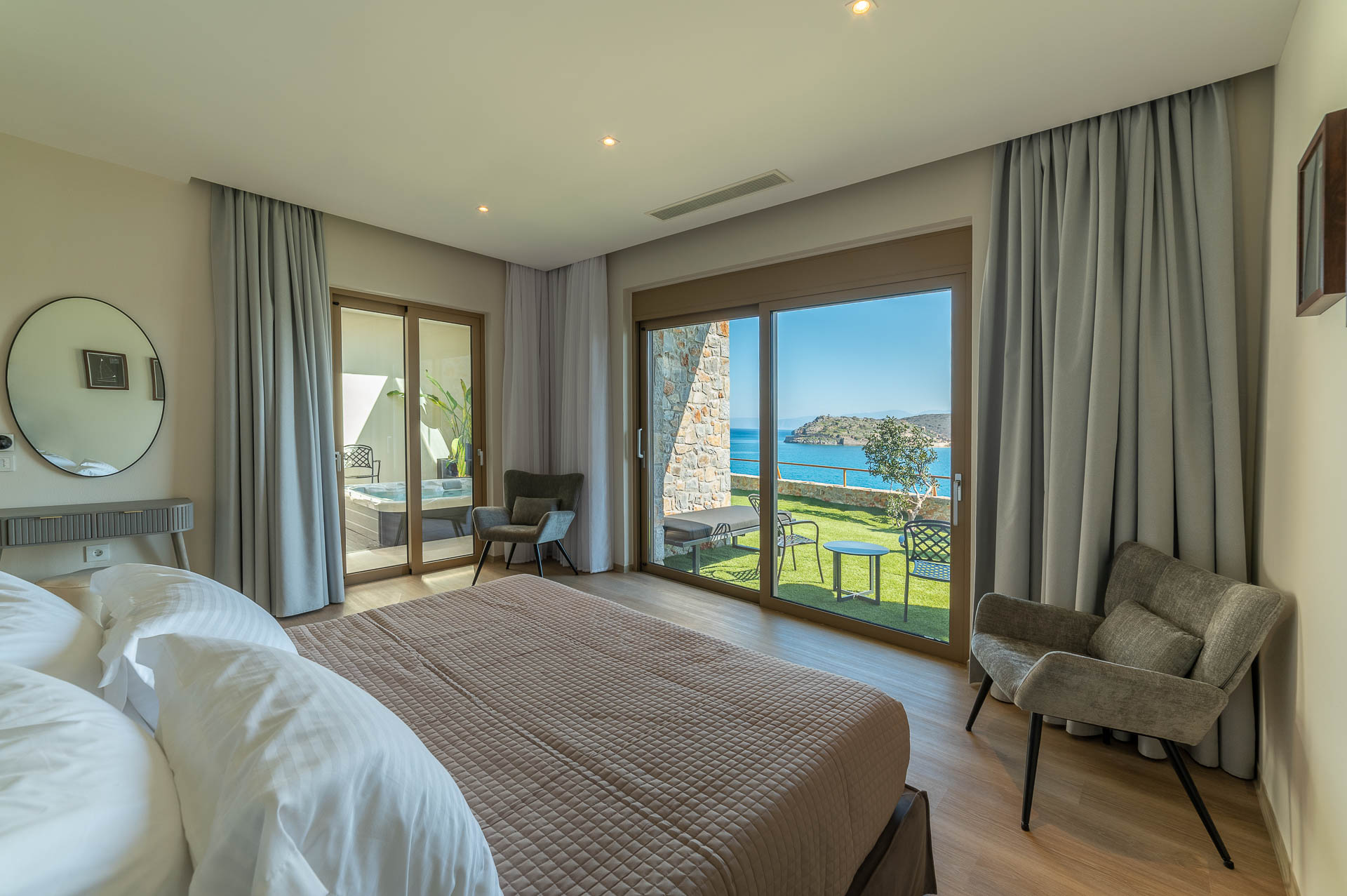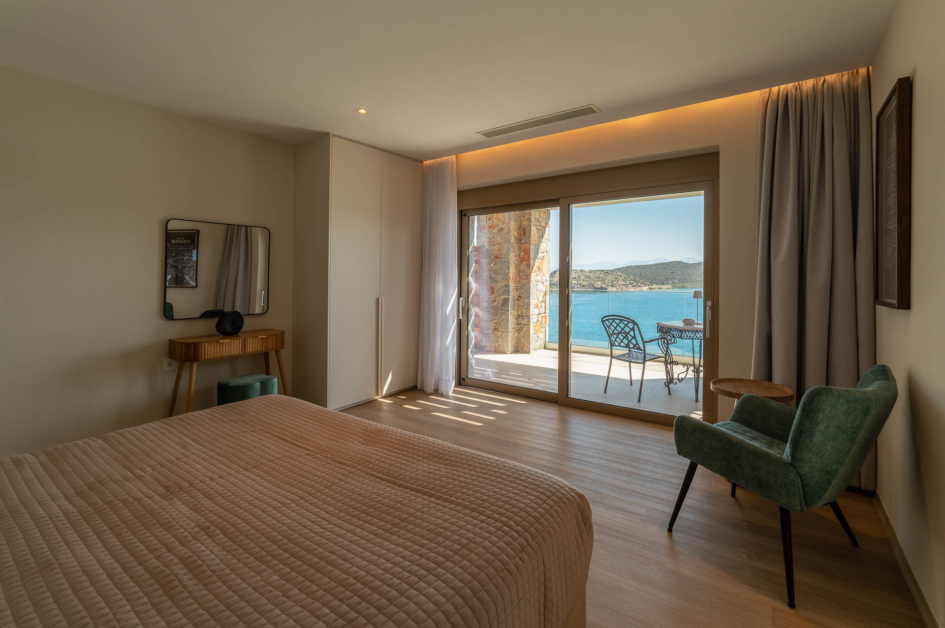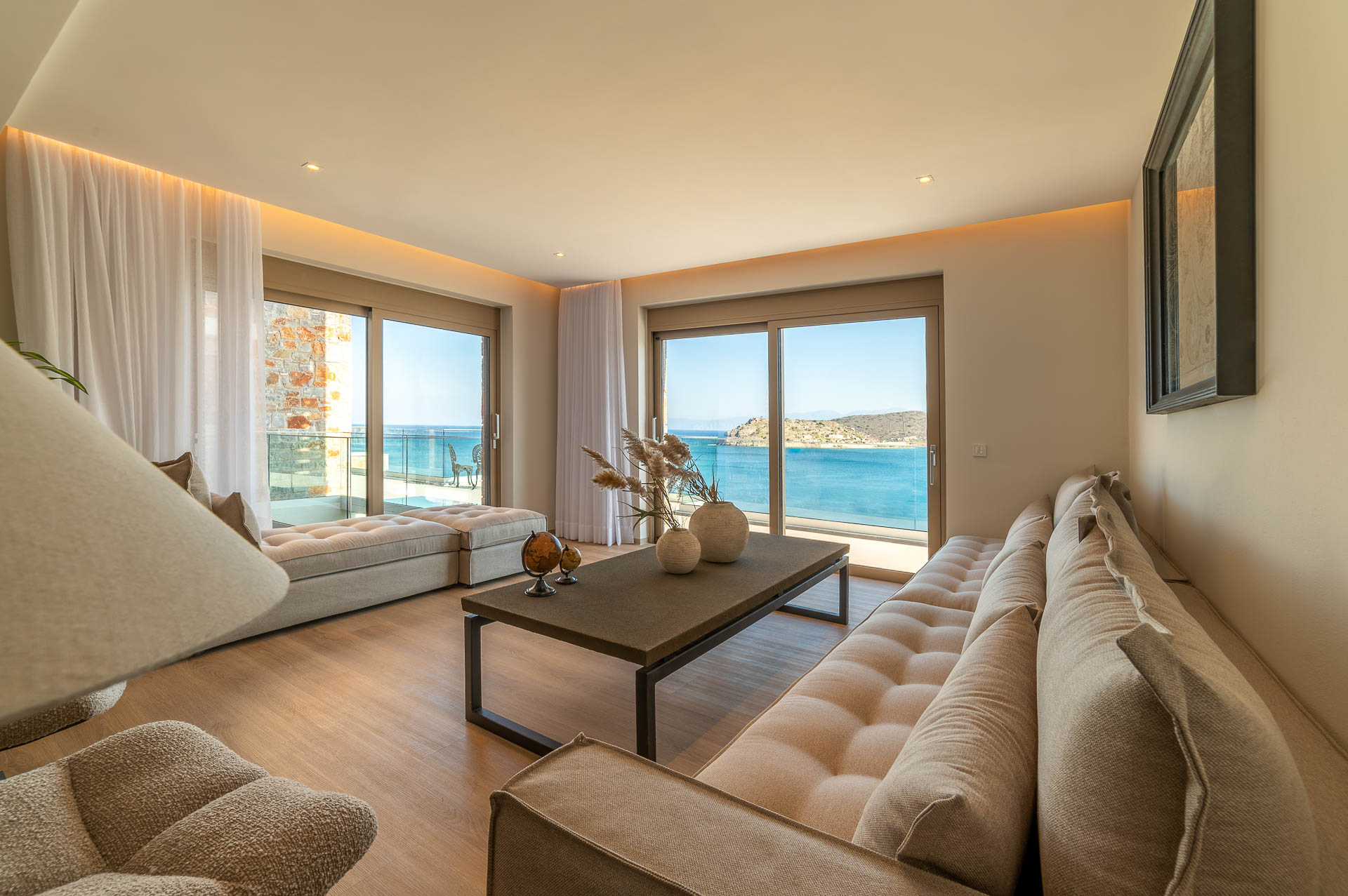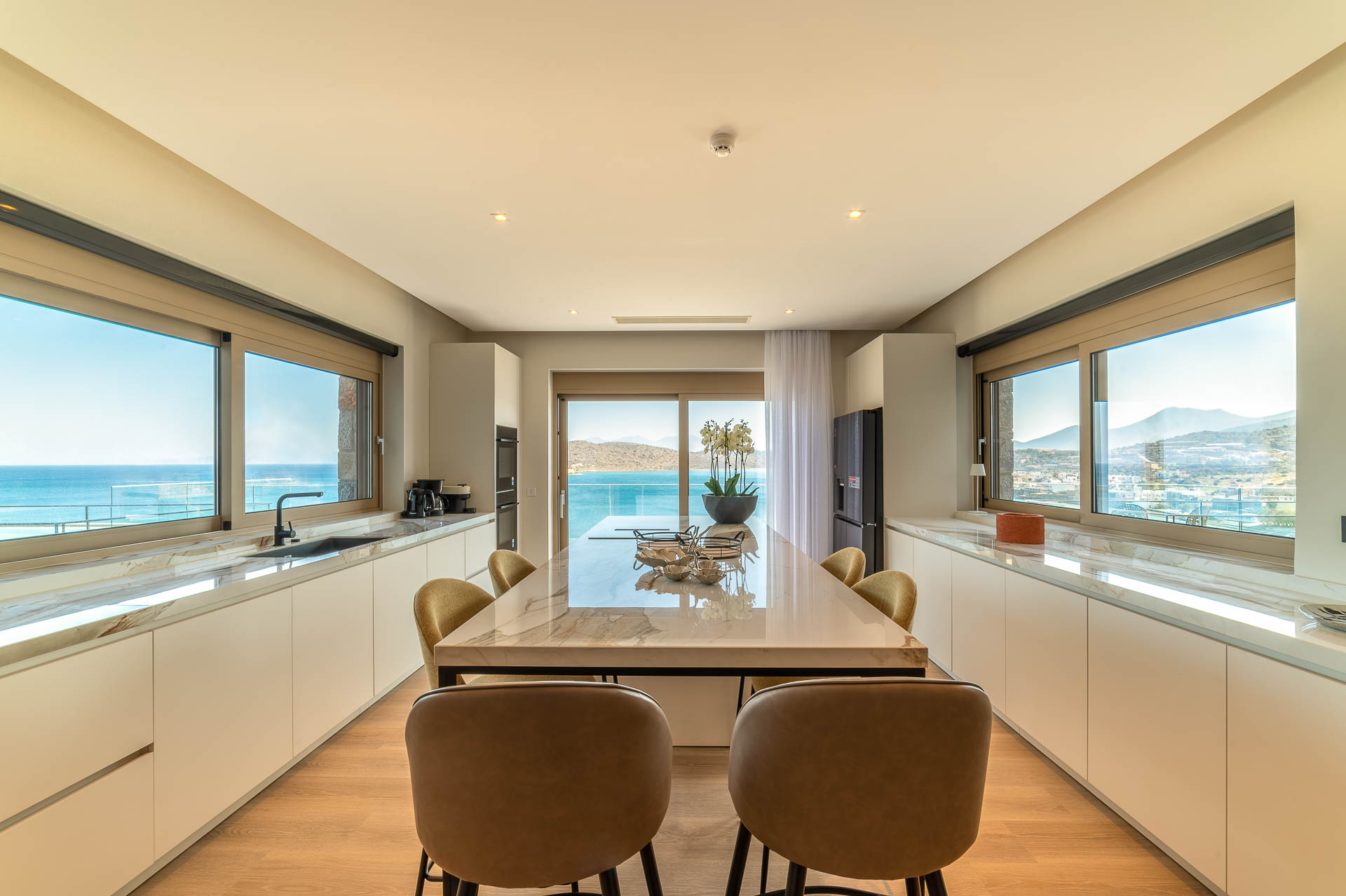 The middle layer consists of the main daytime area and the master suite of Villa Spinalonga; a huge space for the indoor and outdoor living and dining areas on the pool's level. The modern design in off-white and beige tunes match perfectly with the unstoppable view from the Aegean Sea and the islet of Spinalonga. The oversized twin sofas call you to snuggle and luxuriate in the impressive scenery through the expansive sliding glass doors. The stylish dining area is ideal for gatherings, enjoying any meal you wish, and gazing at the enchanting beauty of Spinalonga's Islet. The fully equipped kitchen with an island table and a wine fridge boasts all the major appliances necessary to whip up a delicious meal. All furniture and electrical appliances are selectively chosen with high quality.