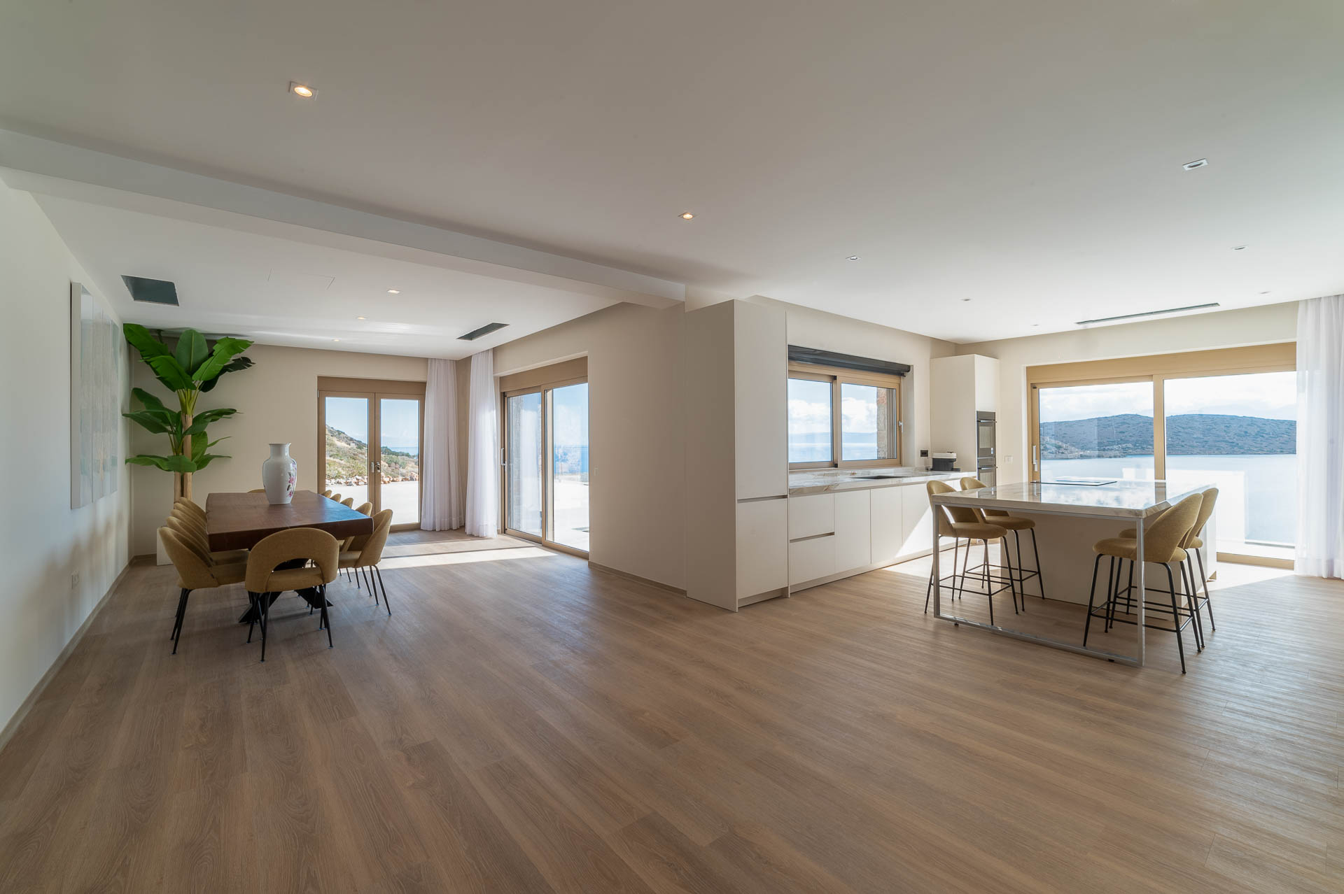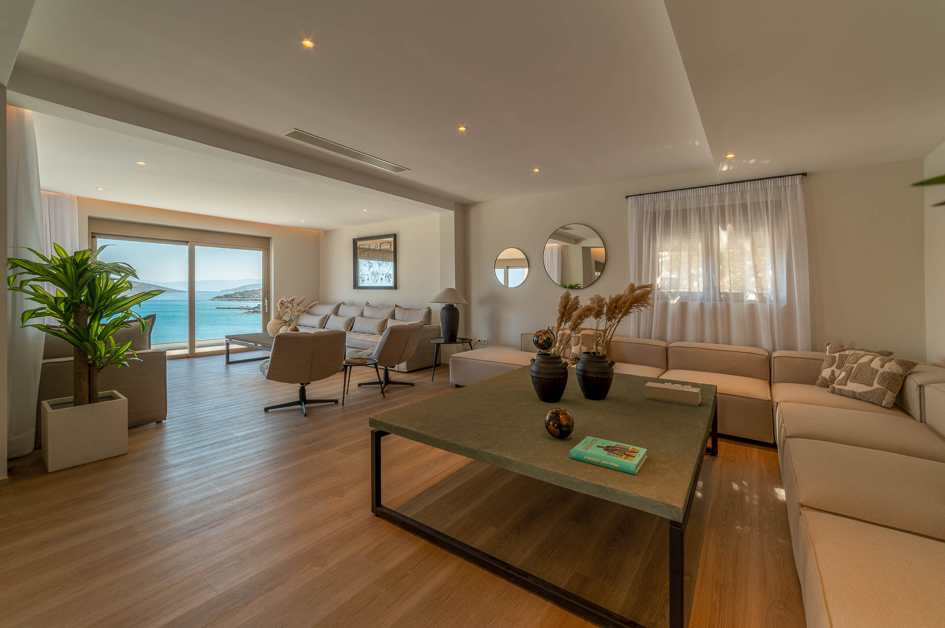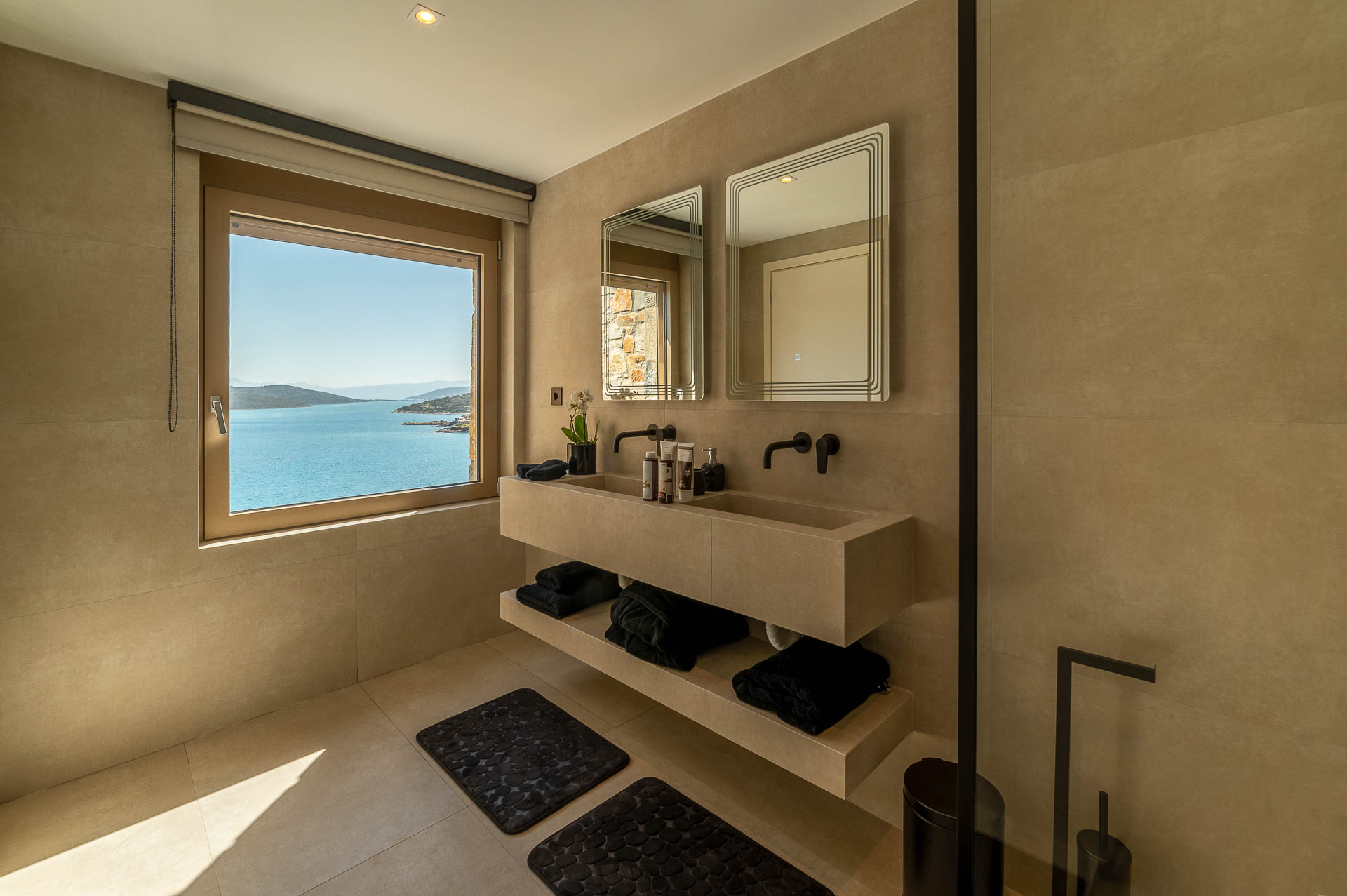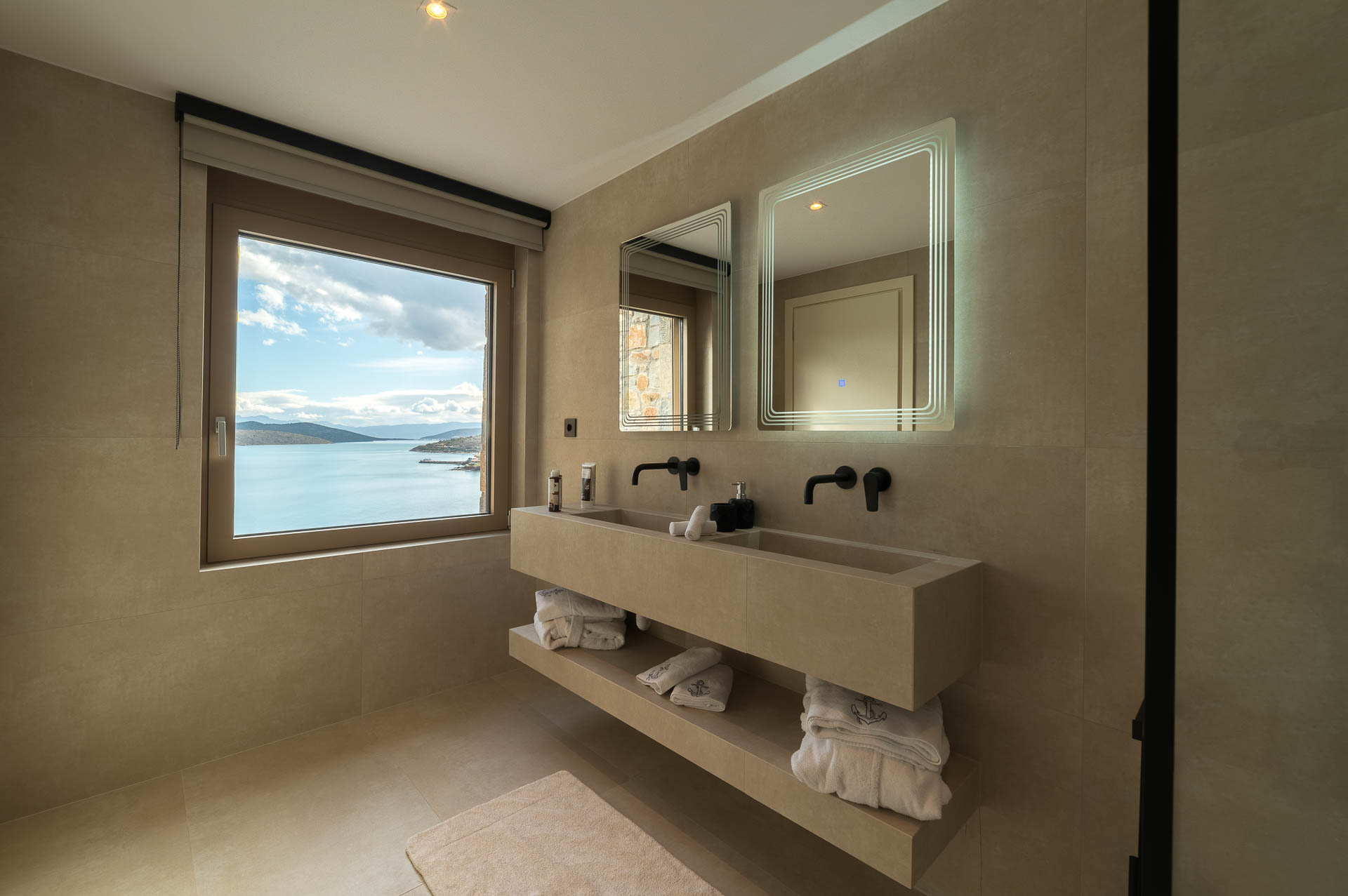 The middle layer consists of the main daytime area and the master suite of Villa Spinalonga; a huge space for the indoor and outdoor living and dining areas on the pool's level. The modern design in off-white and beige tunes match perfectly with the unstoppable view from the Aegean Sea and the islet of Spinalonga. The oversized twin sofas call you to snuggle and luxuriate in the impressive scenery through the expansive sliding glass doors. The stylish dining area is ideal for gatherings, enjoying any meal you wish, and gazing at the enchanting beauty of Spinalonga's Islet. The fully equipped kitchen with an island table and a wine fridge boasts all the major appliances necessary to whip up a delicious meal. All furniture and electrical appliances are selectively chosen with high quality.