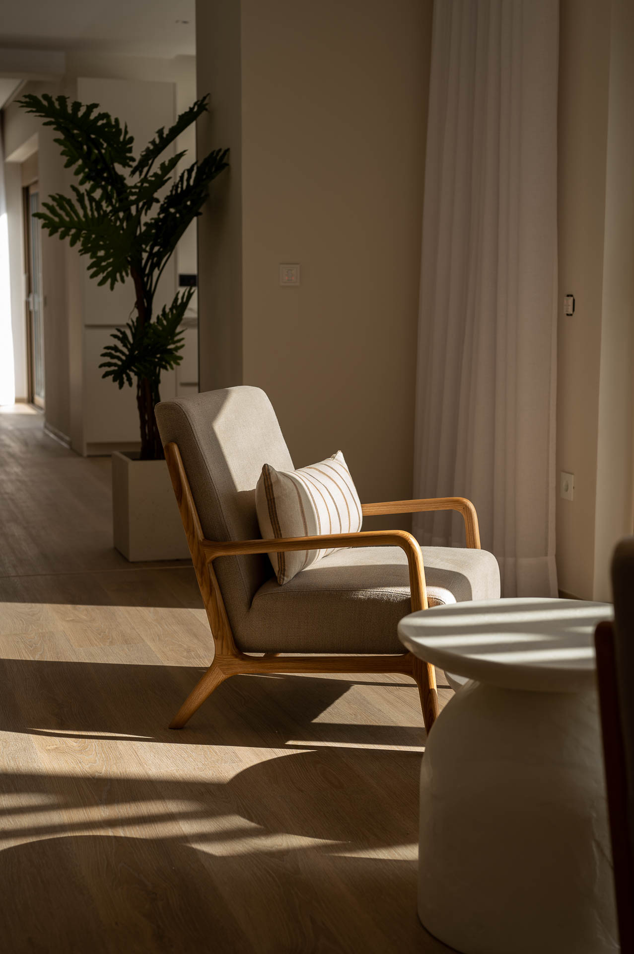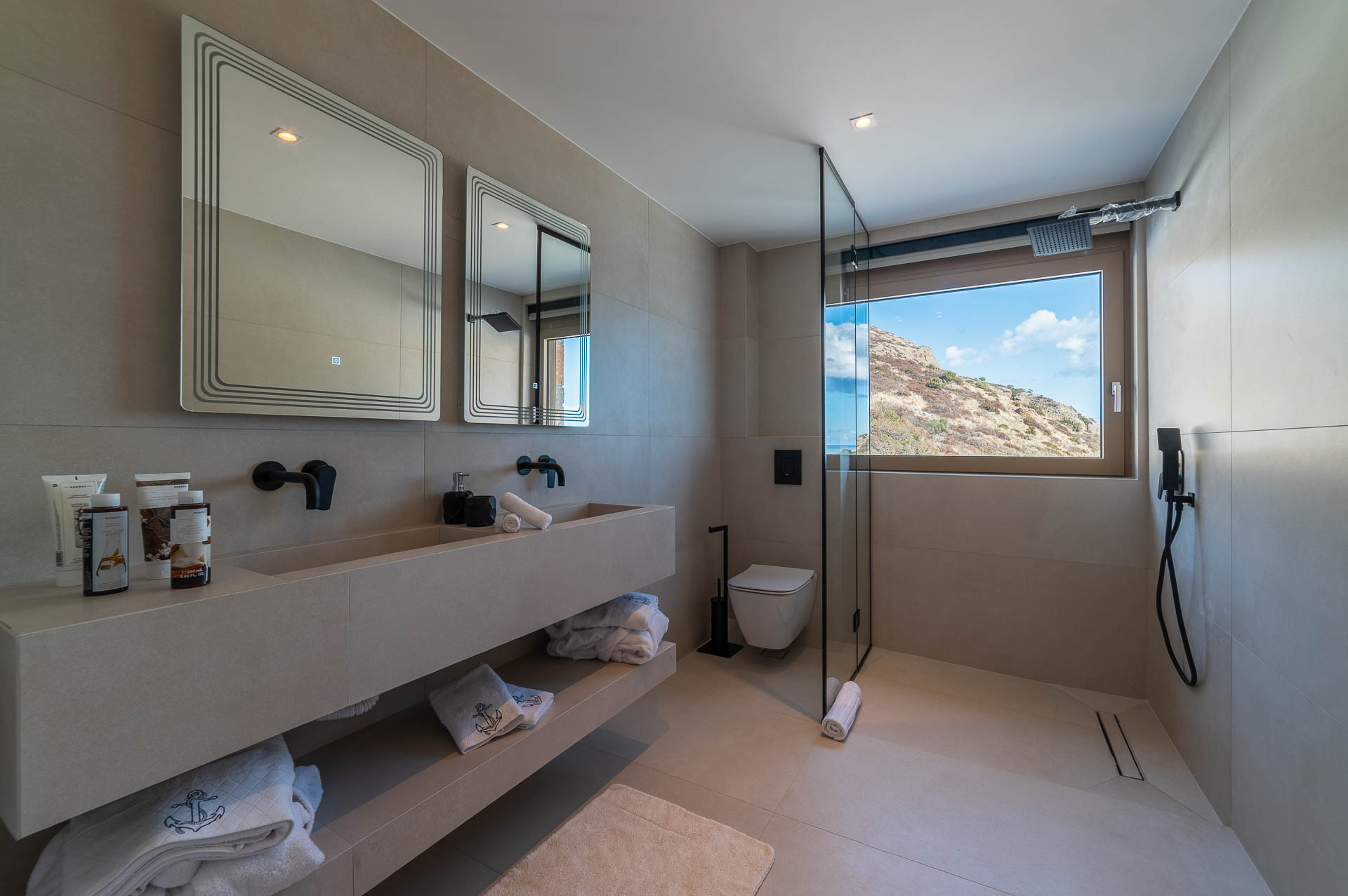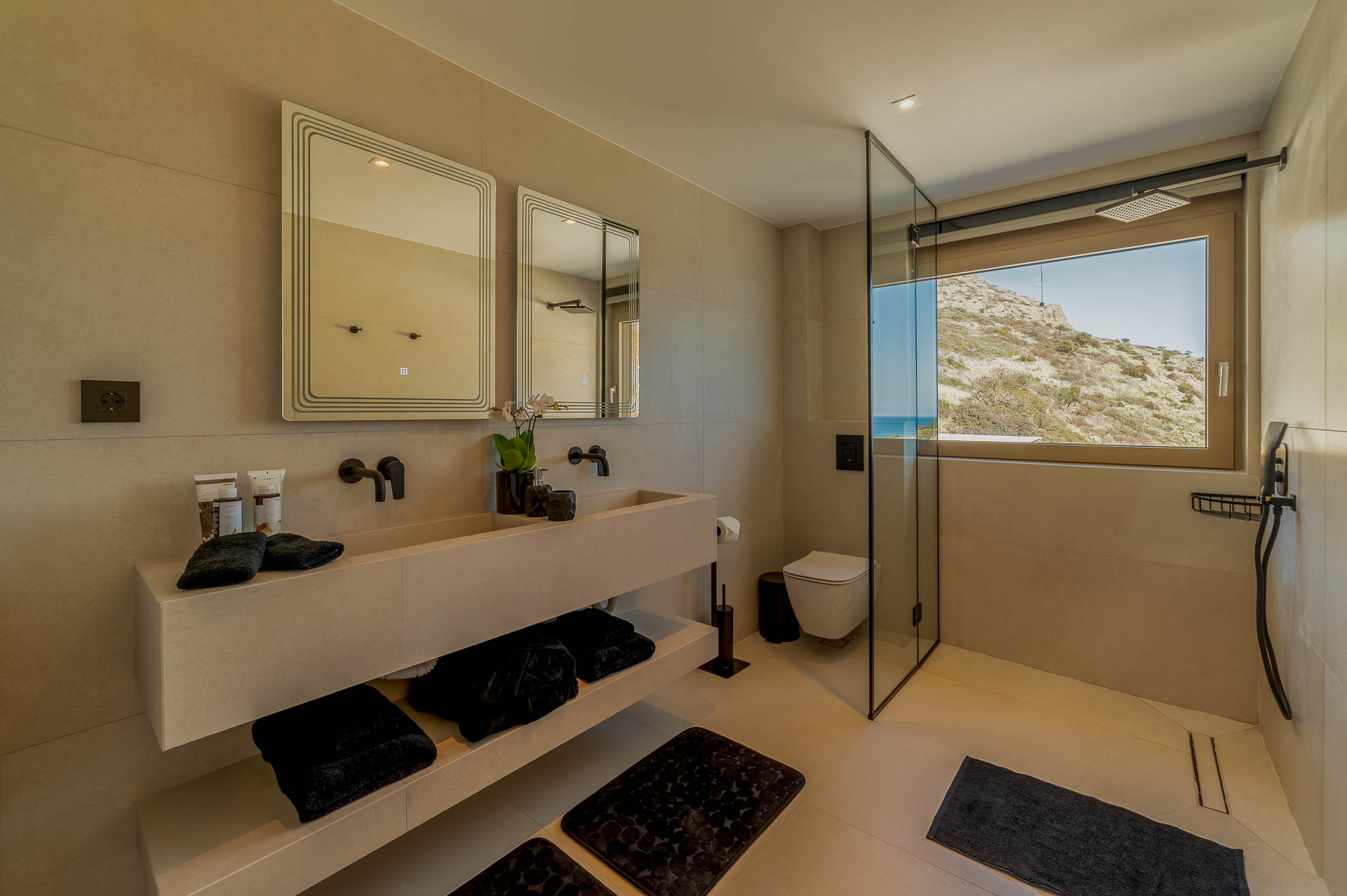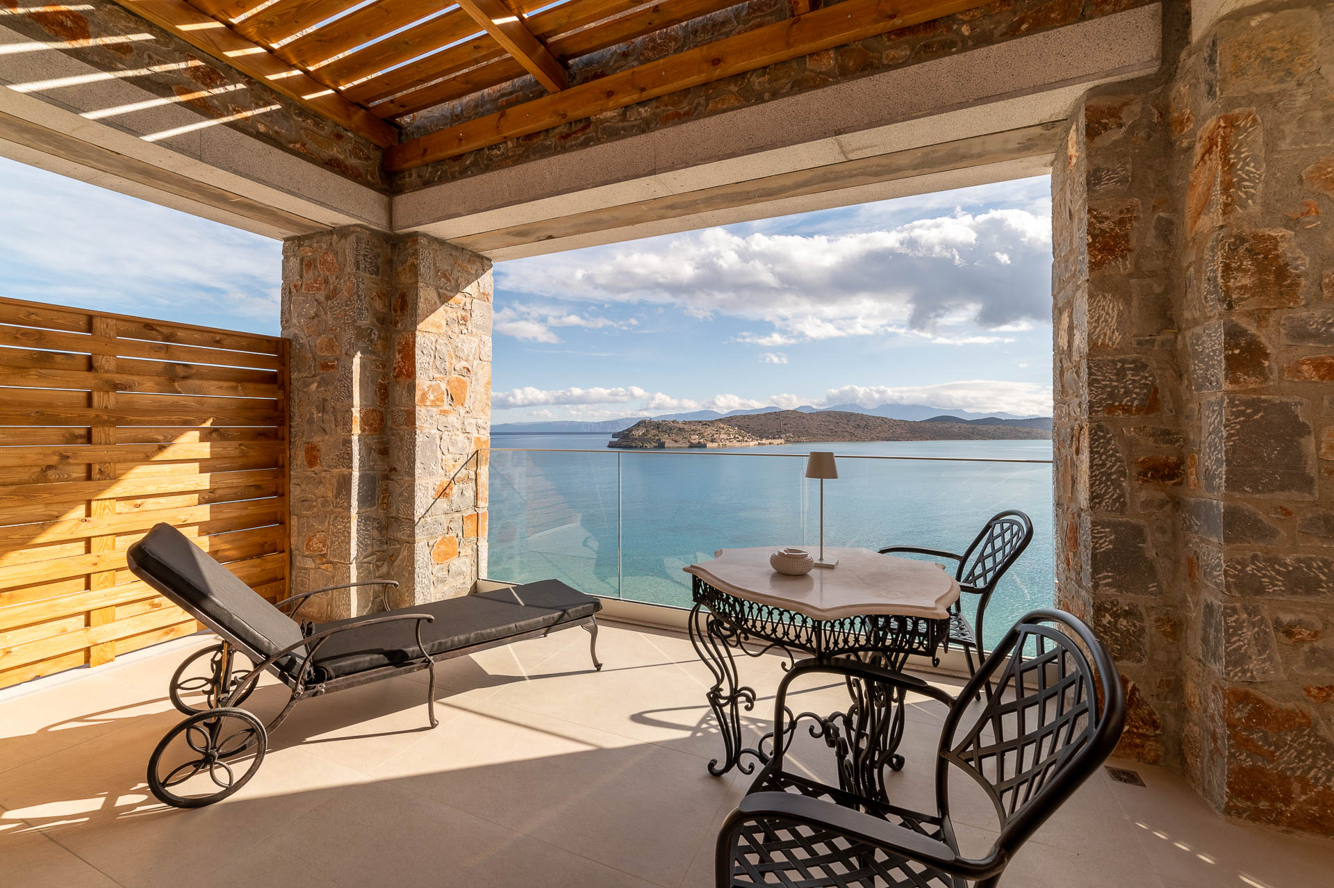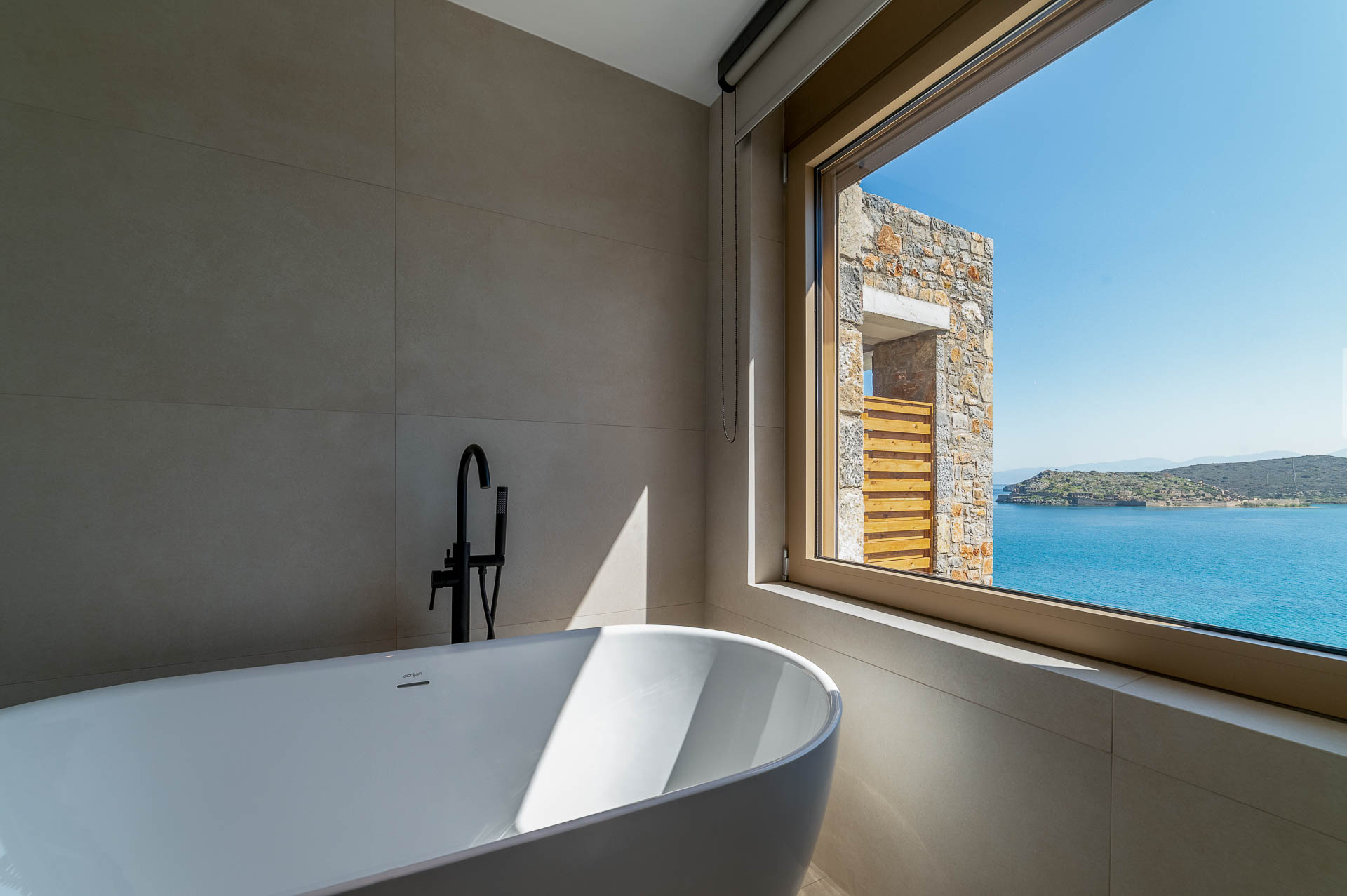 The middle layer consists of the main daytime area and the master suite of Villa Spinalonga; a huge space for the indoor and outdoor living and dining areas on the pool's level. The modern design in off-white and beige tunes match perfectly with the unstoppable view from the Aegean Sea and the islet of Spinalonga. The oversized twin sofas call you to snuggle and luxuriate in the impressive scenery through the expansive sliding glass doors. The stylish dining area is ideal for gatherings, enjoying any meal you wish, and gazing at the enchanting beauty of Spinalonga's Islet. The fully equipped kitchen with an island table and a wine fridge boasts all the major appliances necessary to whip up a delicious meal. All furniture and electrical appliances are selectively chosen with high quality.