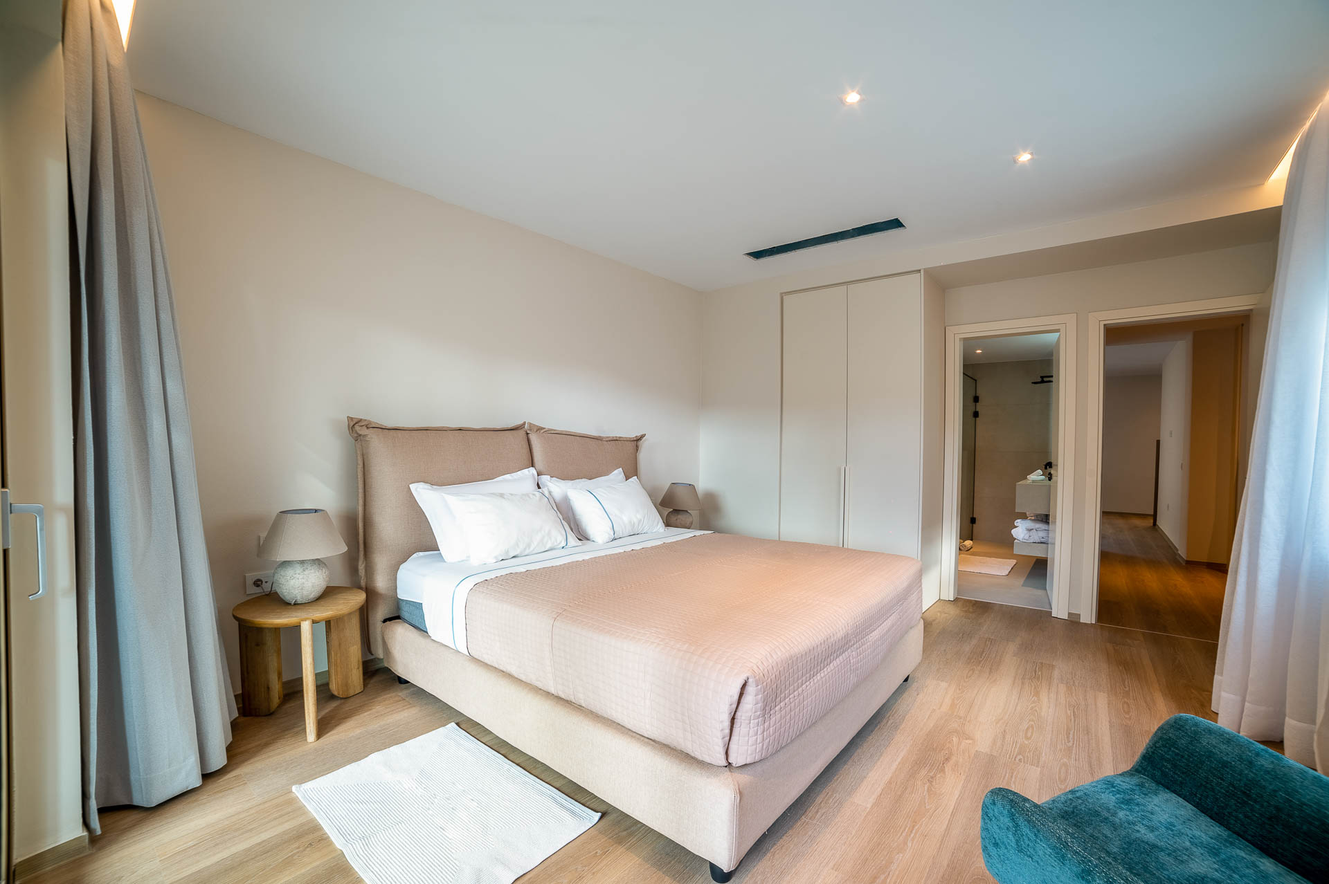 The middle layer consists of the main daytime area and the master suite of Villa Spinalonga; a huge space for the indoor and outdoor living and dining areas on the pool’s level. The modern design in off-white and beige tunes match perfectly with the unstoppable view from the Aegean Sea and the islet of Spinalonga. The oversized twin sofas call you to snuggle and luxuriate in the impressive scenery through the expansive sliding glass doors. The stylish dining area is ideal for gatherings, enjoying any meal you wish, and gazing at the enchanting beauty of Spinalonga’s Islet. The fully equipped kitchen with an island table and a wine fridge boasts all the major appliances necessary to whip up a delicious meal. All furniture and electrical appliances are selectively chosen with high quality.