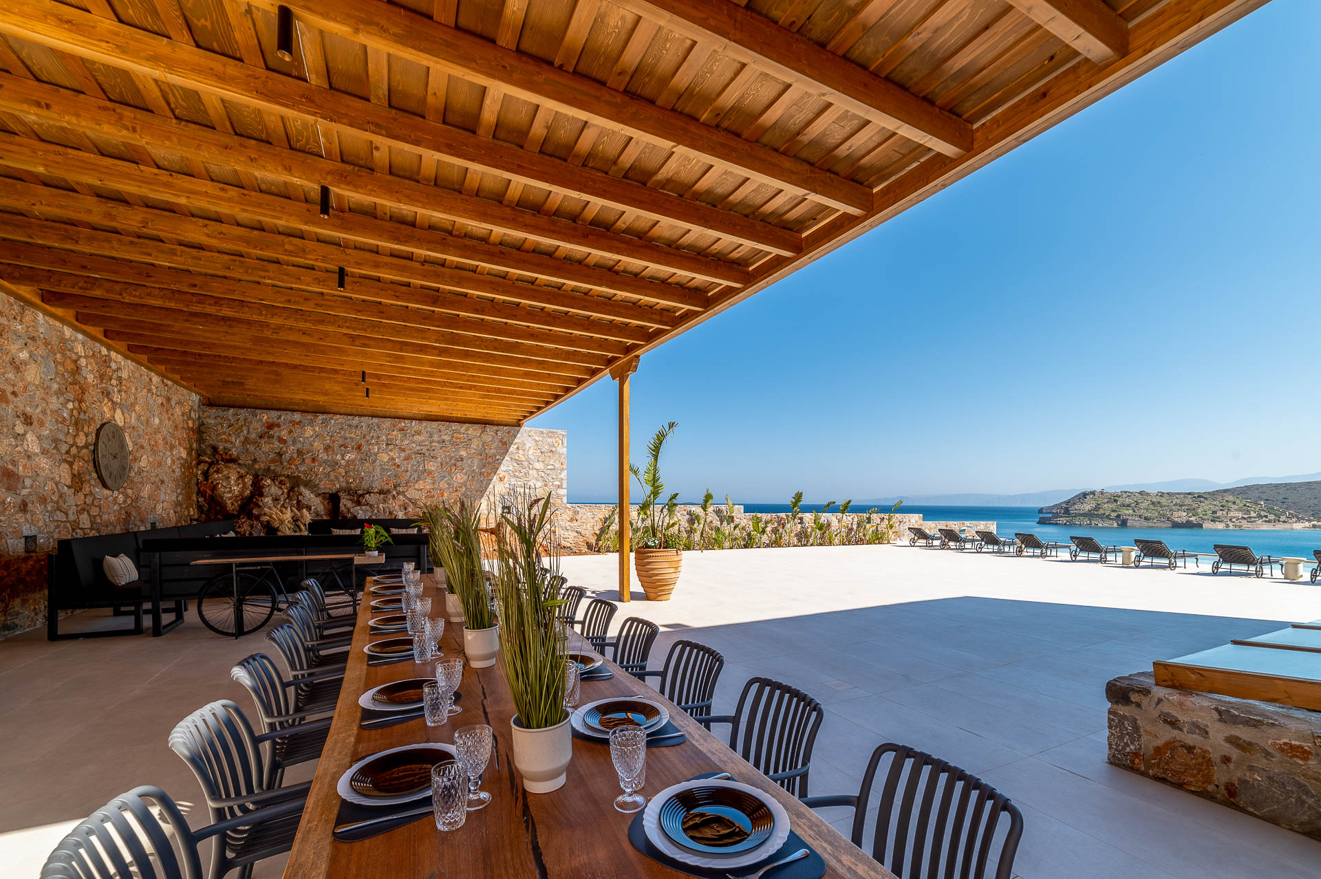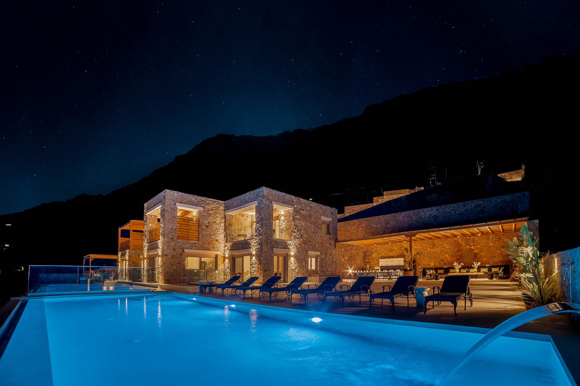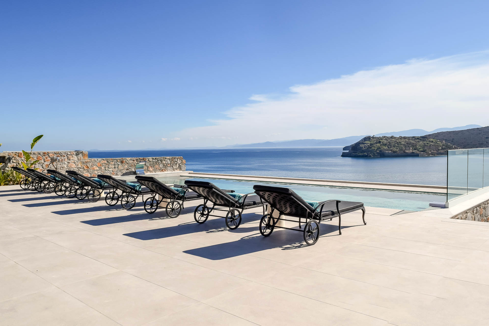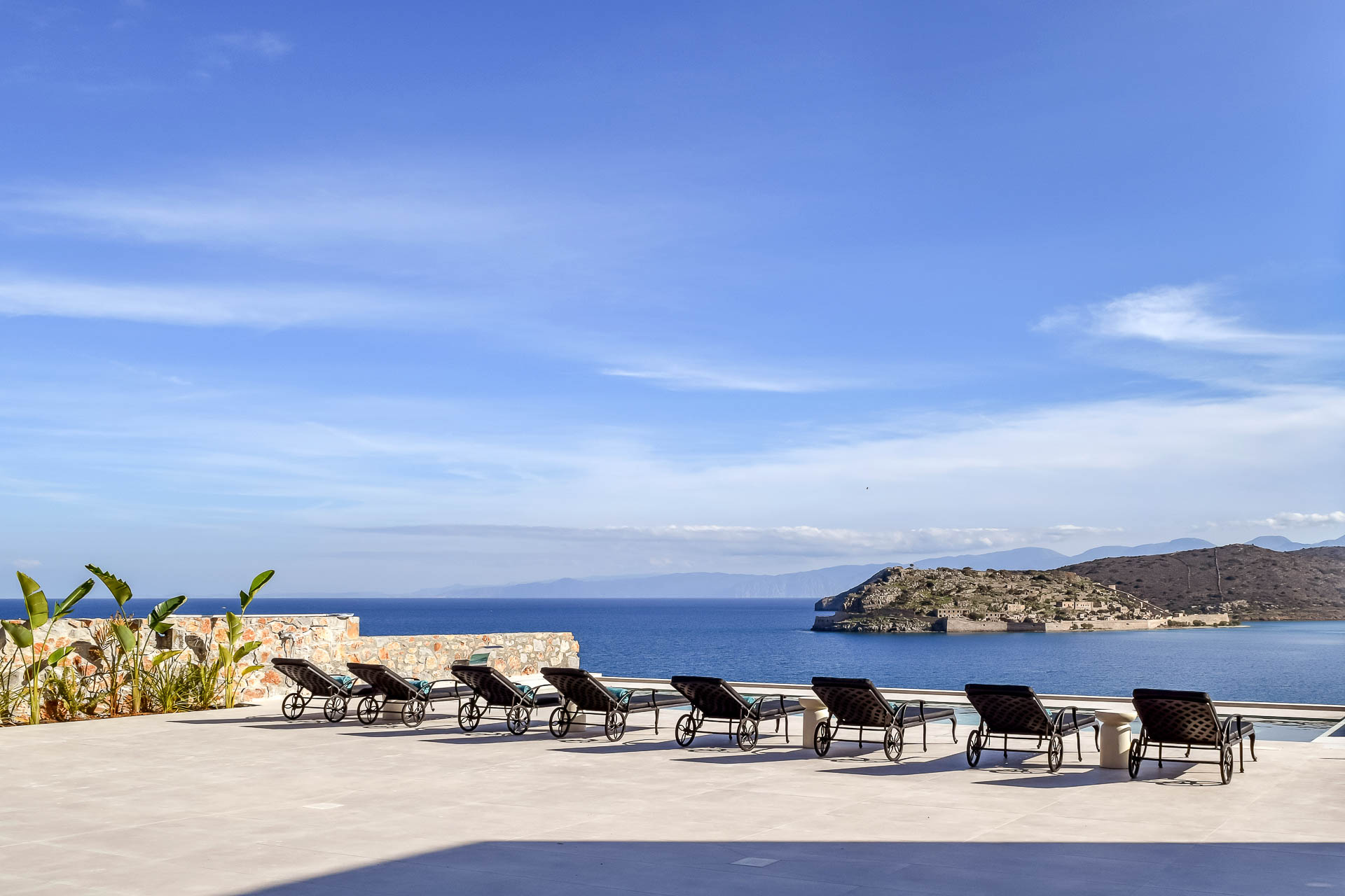 Villa Spinalonga is on a rocky slope overlooking the Aegean Sea and Spinalonga Islet, distributed over three layers, offering captivating views from every edge. The villa includes 10 bedrooms with ensuite bathrooms, 3 living and 2 dining areas, 3 kitchens (indoors and outdoors), a fully equipped fitness area (gym, massage room, sauna, 2 Jacuzzis), and an elevator! So, 20 guests can enjoy this truly luxurious and tranquil residence of 745 sqm!