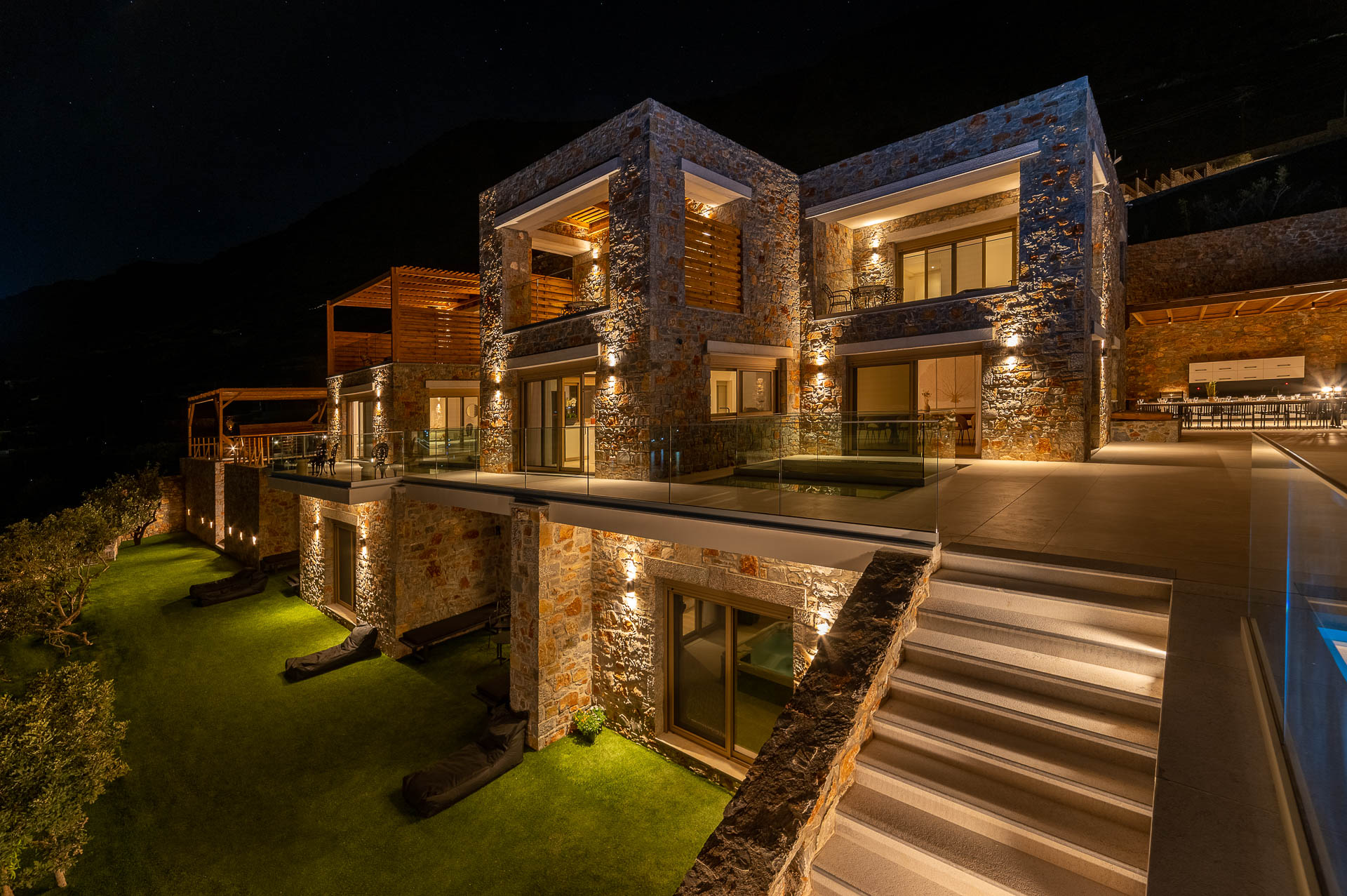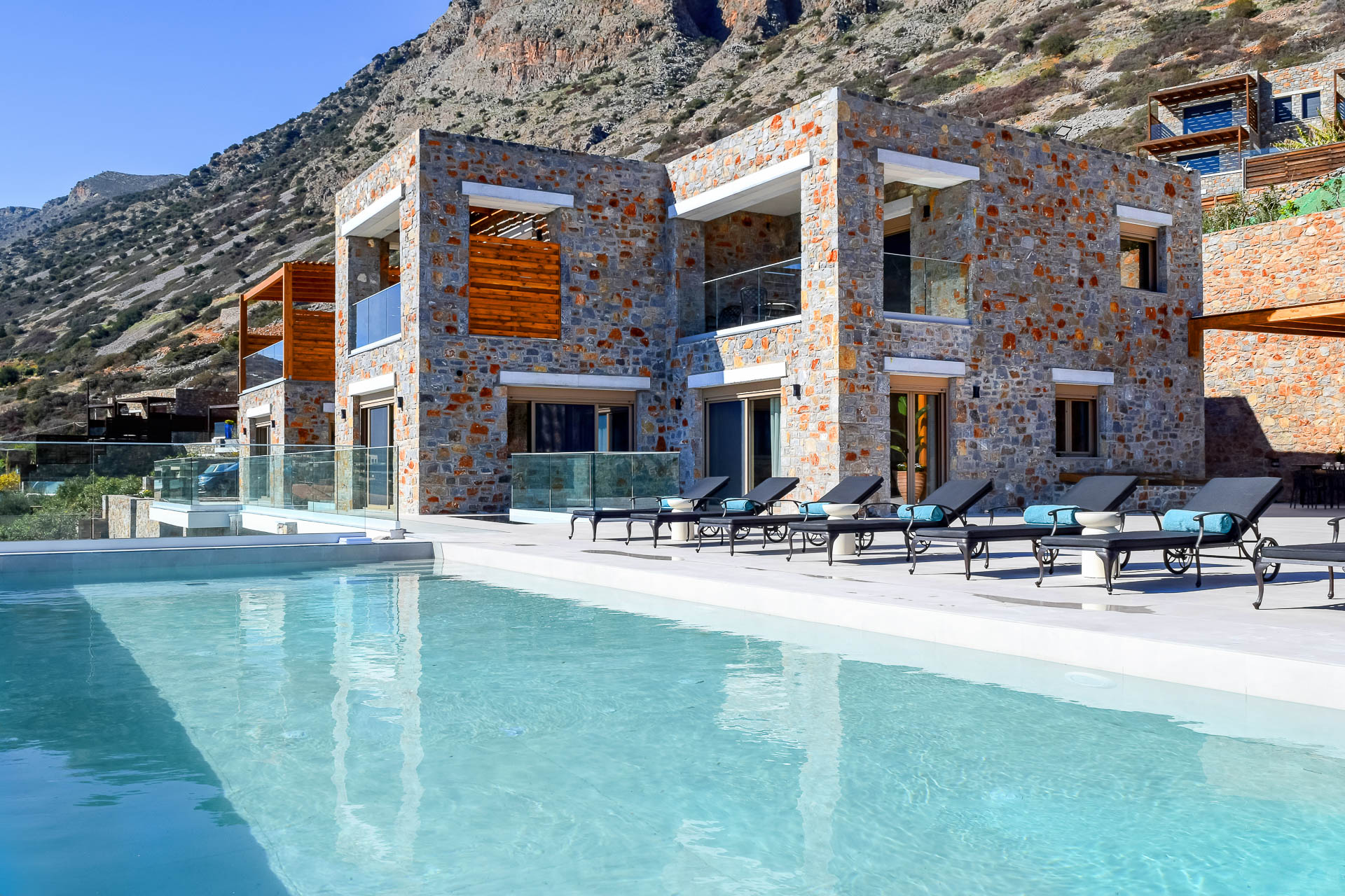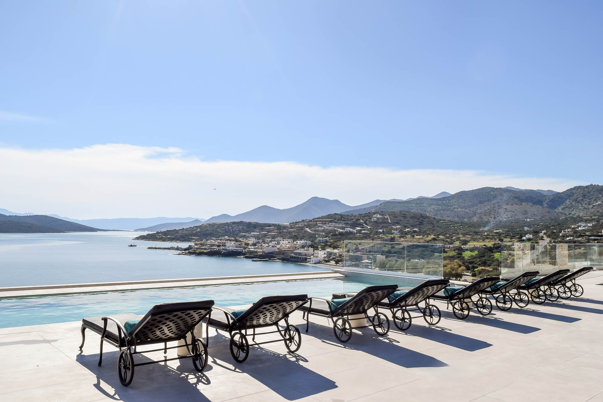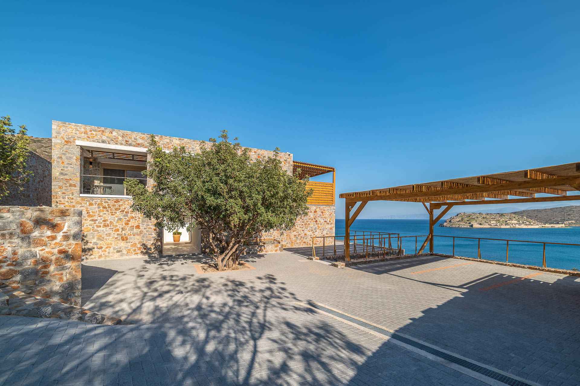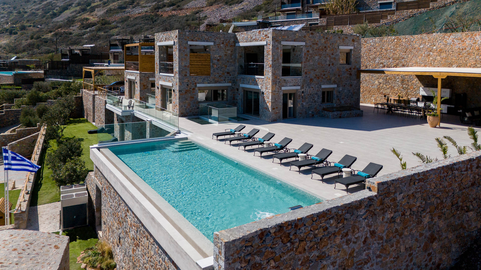 Villa Spinalonga is on a rocky slope overlooking the Aegean Sea and Spinalonga Islet, distributed over three layers, offering captivating views from every edge. The villa includes 10 bedrooms with ensuite bathrooms, 3 living and 2 dining areas, 3 kitchens (indoors and outdoors), a fully equipped fitness area (gym, massage room, sauna, 2 Jacuzzis), and an elevator! So, 20 guests can enjoy this truly luxurious and tranquil residence of 745 sqm!