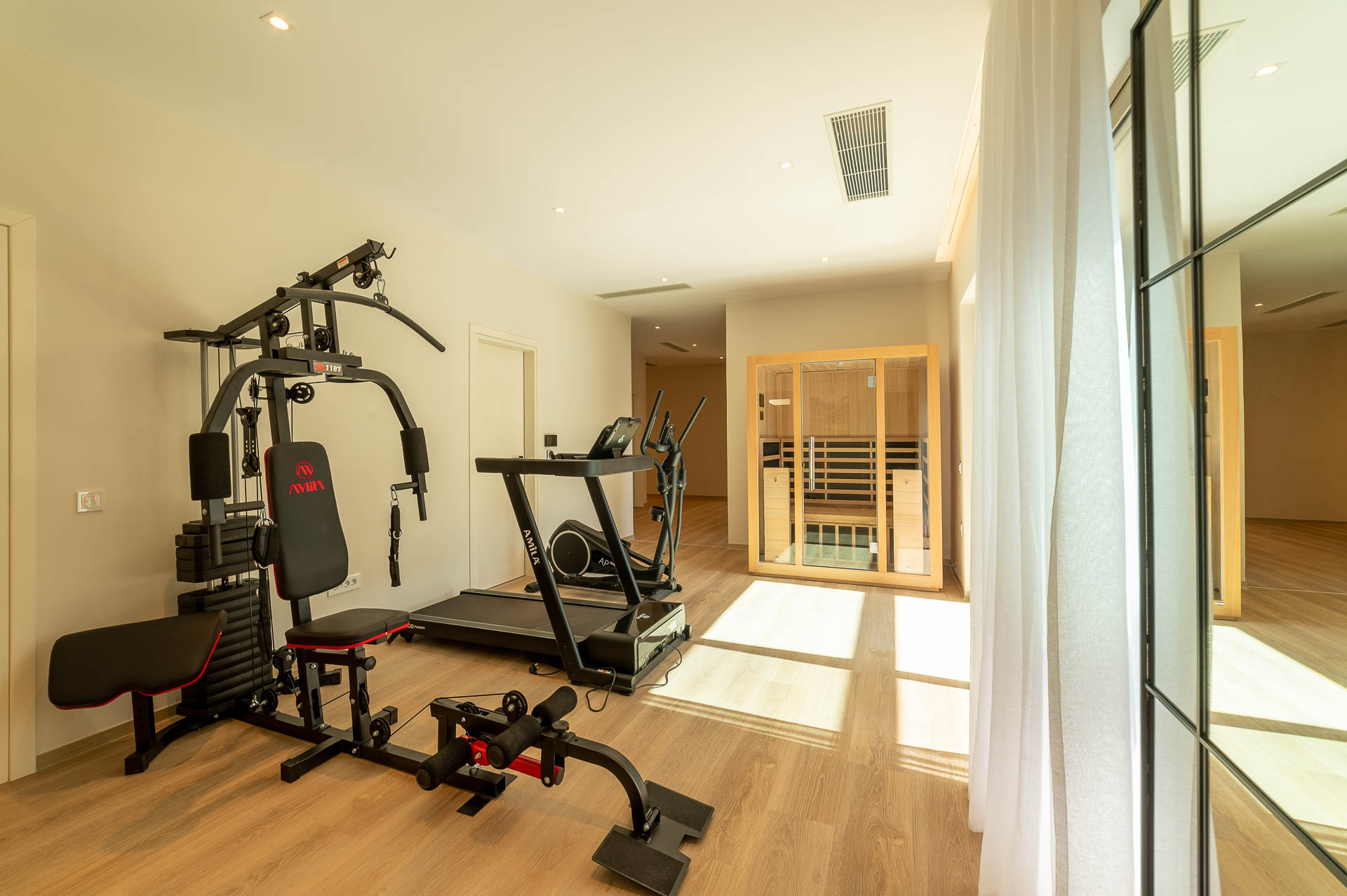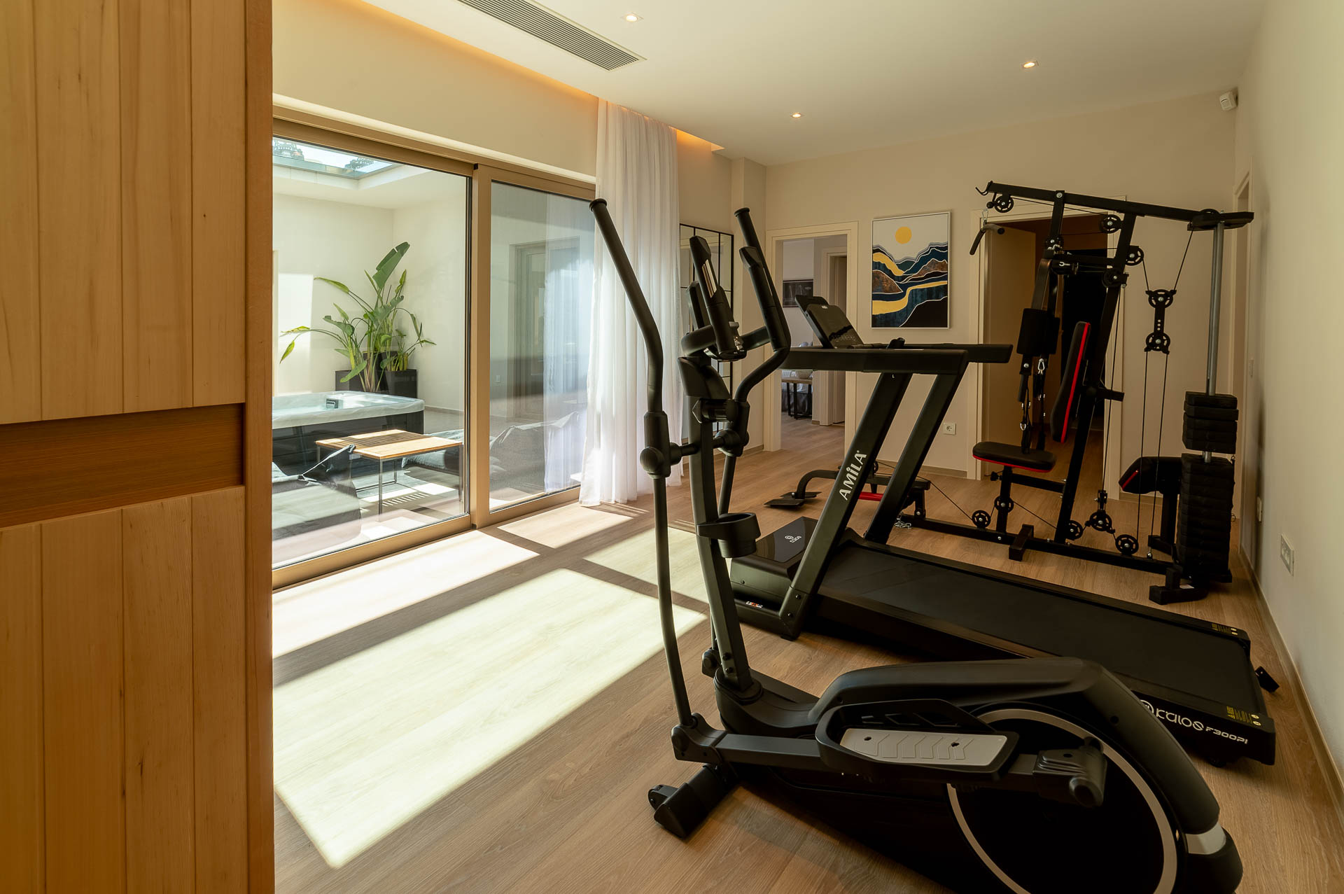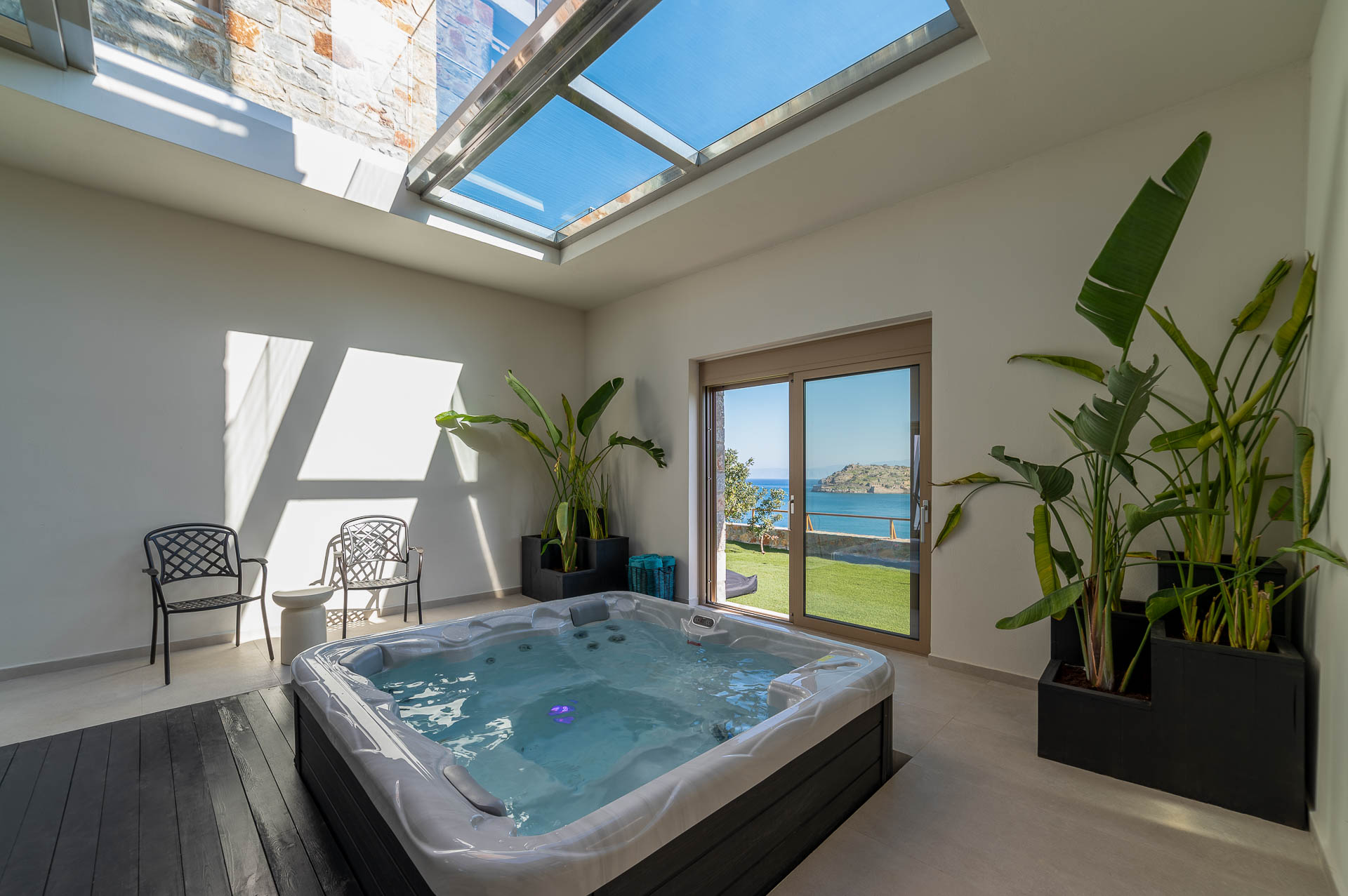 The lower level has five inviting bedrooms, a small kitchenette and a rejuvenating area with gym, massage room, hammam and jacuzzi. An indoor glassy atrium with a skylight and sea-view on the front is ideal to enjoy an in-house relaxing jacuzzi! Next to jacuzzi is the gym with a treadmill, a weight machine and a cross-trainer. How about rejuvenating with a massage in your privacy or even with a hot hammam?