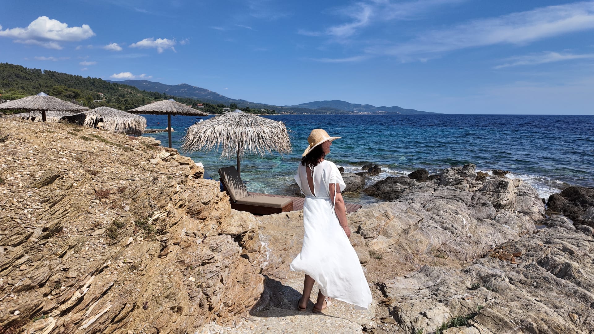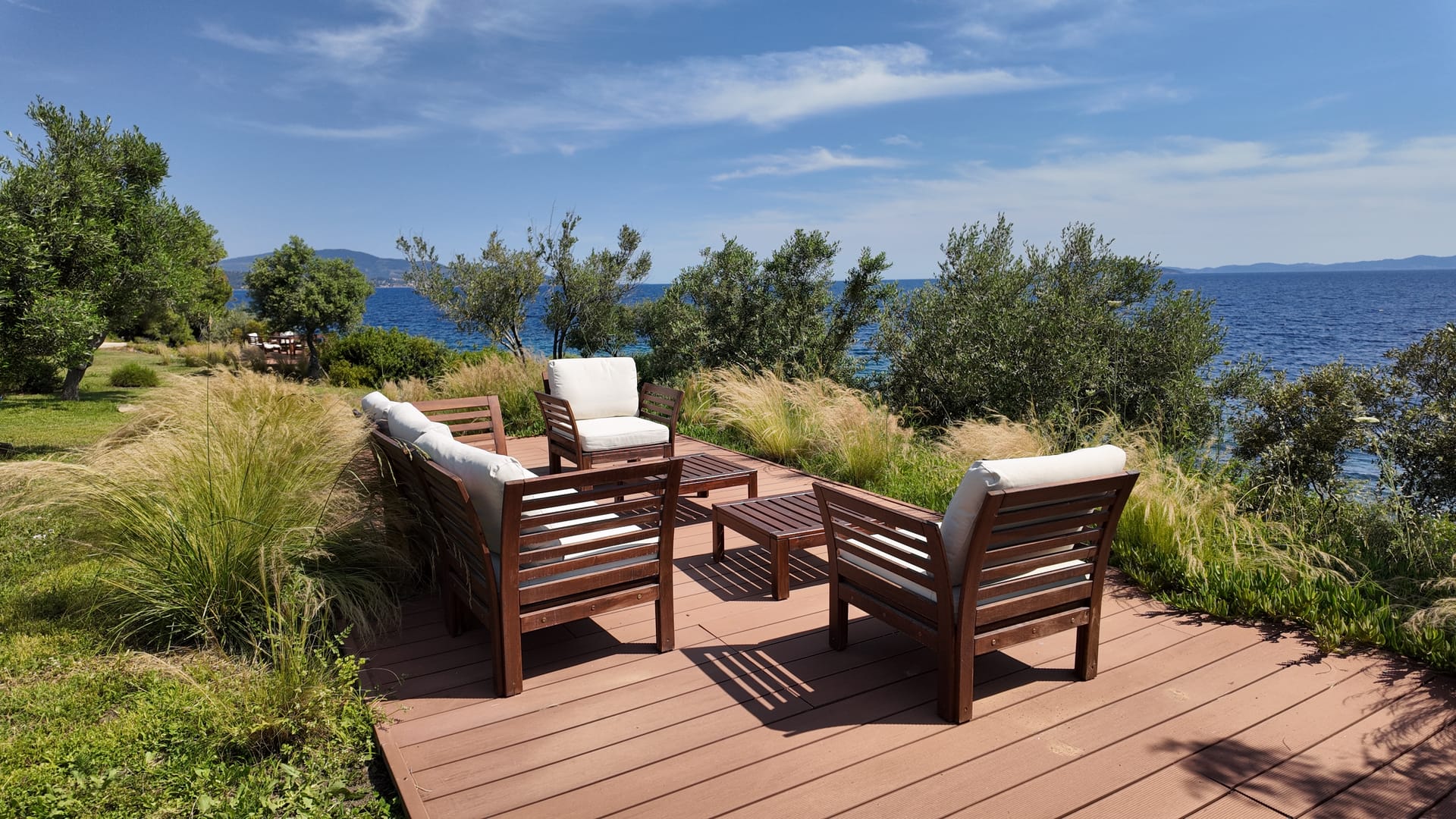Villa Moriai is in the same area as Villa Limpet and Villa Craggy; each maintains its privacy with a new-built fence (it isn’t shown in the photos). The location is on the coastline of the renowned Greek peninsula of Sithonia, in Halkidiki. The villa’s complex includes a private parking area and a footpath to an isolated pristine beach. Also, at the backside of the property, you can visit the ruins of an early Christian church that was discovered and unearthed.
